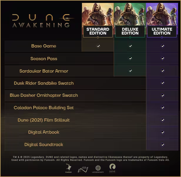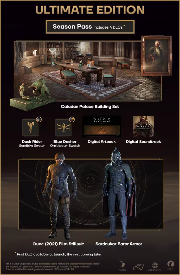 CREATE a persona as unique as your ambitions. Craft anything from Fremen stillsuits to Harkonnen ornithopters and fine Atreides furniture. Customize endlessly with emotes, transmog systems, and swatches that let you stand out in the desert.