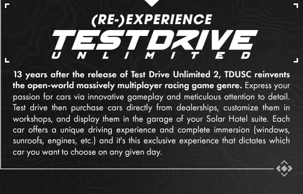You who like open world Driving/Racing/Sim games; this is a good Stop ''N'' Go; but, what you take with you when you play this game is a "Testament" " " to the Test Drive titles dating back into my teenage years... I wonder if they are related to this game... Just pretending; the graphics and experience I get from this MMO Open World Racer/Driver/Sim is indeed Test Drive nostalgia that comes from preserving key valued elements with realistic 3D design, a smart weather system and now with an A.I. integrated into Two lands to drive On, or Off-road, anywhere there's a surface you can drive on... Like cars and testing their signature handling that you can also fine tune with car parts and adjusting these parts? This... game... I Love Test Drive Unlimited Solar Crown