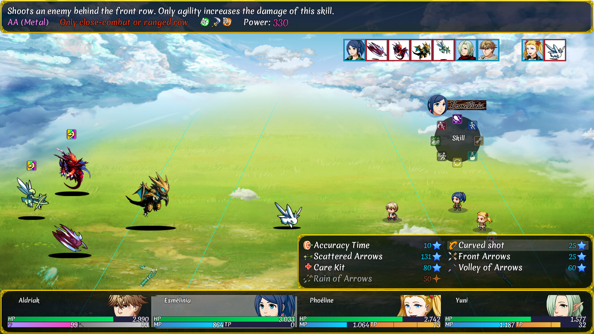 Aldriak, the advent of a new world takes place in a fantastic open world in which the player accompanies the heroes through their saga. It's an RPG turn-based strategy game inspired by the first games of the genre but with a new and original mechanic. This mechanic takes the form of 3 distinct rows in which all the fighters (players and creatures) are placed. Each skill requires being in a particular row and can only target by following certain rules.