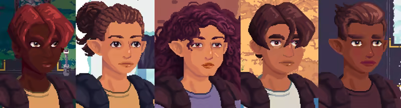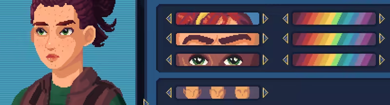 The player character is completely customisable:  facial features, hair, skin colour, clothing, name and pronoun. Their custom portrait appears during dialogue sequences in the game, and the in-game character also displays the changes.