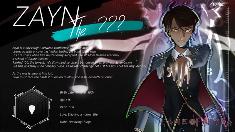 You are Zayn, the lowest-ranked student in the school. One day, you receive a mysterious message about a TEST. Soon, you realize you're not alone—six of your classmates have been pulled into it as well. There's no way to refuse, and no way to escape.