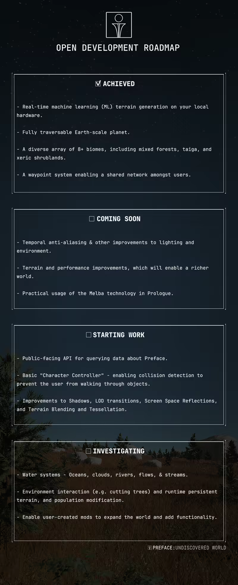 Preface is an immersive tech demo showcasing Melba, PLAYERUNKNOWN Productions' groundbreaking technology generating an Earth-scale world. In this project still in development, experience our Machine Learning agents creating a dynamic planet in real-time, all processed directly on your GPU - with no reliance on cloud services.