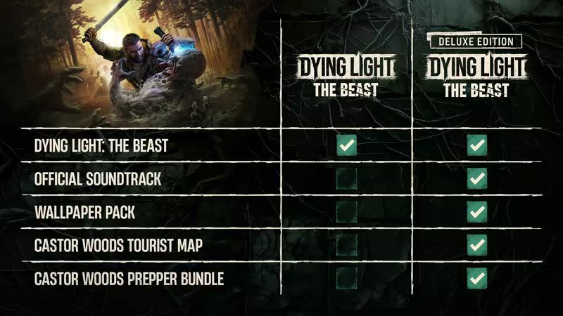 Take your Dying Light: The Beast experience to another level with the Deluxe Edition. You'll receive the Official Soundtrack, wallpapers, and the Castor Woods Prepper Bundle, as well as a detailed tourist map that highlights locations worth exploring.
