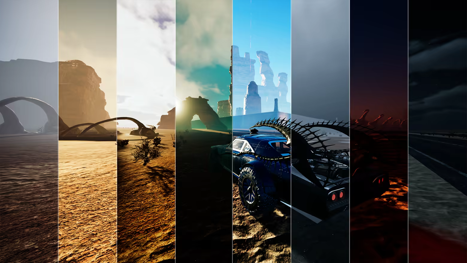 Vehicle combat shooter with roguelike progression, customization, and exploration.