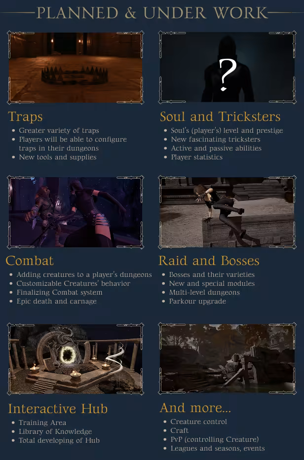 In a world where greed surpasses fear, only the cleverest will endure. Design your own dungeon—a lethal snare for anyone who dares to be tempted by your riches. Clever traps, merciless creatures, and complex mazes — all crafted to thwart intruders. Alternatively, take a chance by exploring other players' dungeons, evading deadly traps and claiming their treasures. But remember — death in this world is not final, it's merely another lost opportunity.
