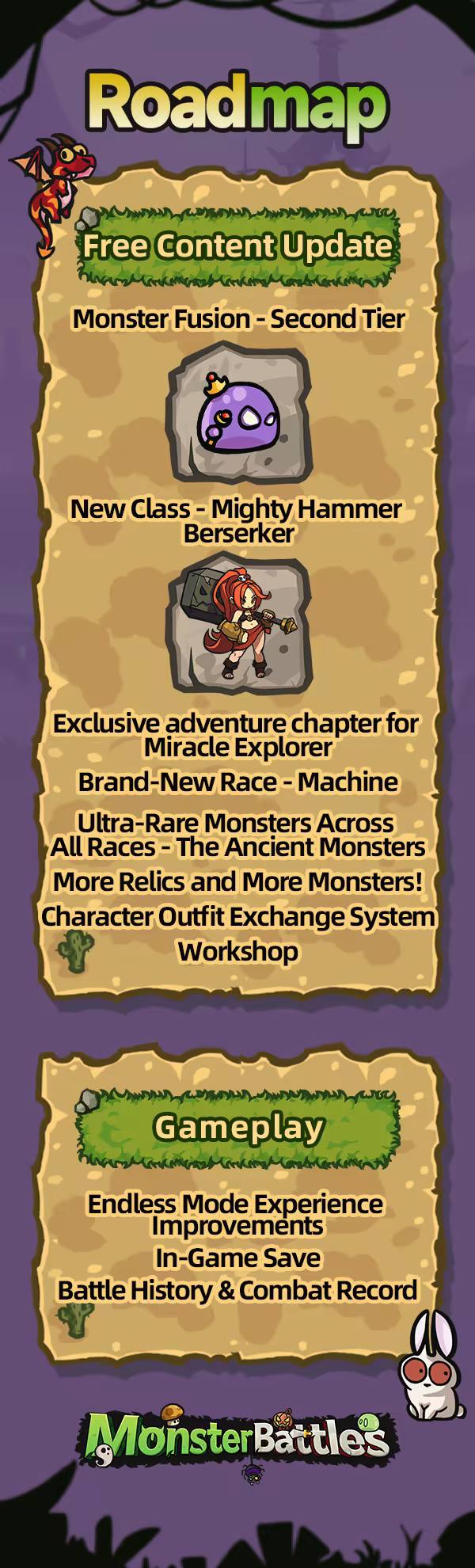 Monsters will have different races, shapes, sizes, and rarity. The correct combination and distribution of them are the key to enhancing combat power!