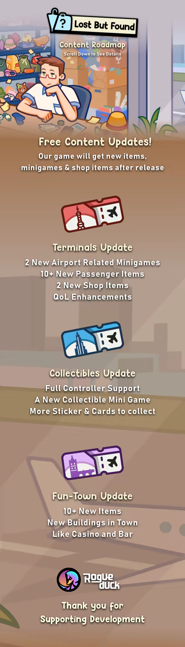 As much as I wanted to enjoy the game, [i]Lost But Found[/i] lacks diverse tasks to keep me interested. By day 15, I felt burnt out from the repetitive motions and identical interactions with passengers. Most of the upgrades were far too easy to achieve, and the absence of more end-game goals to work toward made the game extremely difficult to grind through for achievements. I love the art style and the general concept, but this game could really benefit from things like: a more developed city to explore, the ability to customize the desk / airport environment more, or even providing passengers / side characters that need multiple items found to fulfill quest lines with them. The interactions with the Black Marketeers, security officers, and the homeless man all felt like missed opportunities for this, considering how often you interact with them without receiving very much in return. In it's current state, I can't recommend the game due to how incomplete it feels. I hope the Devs ...
