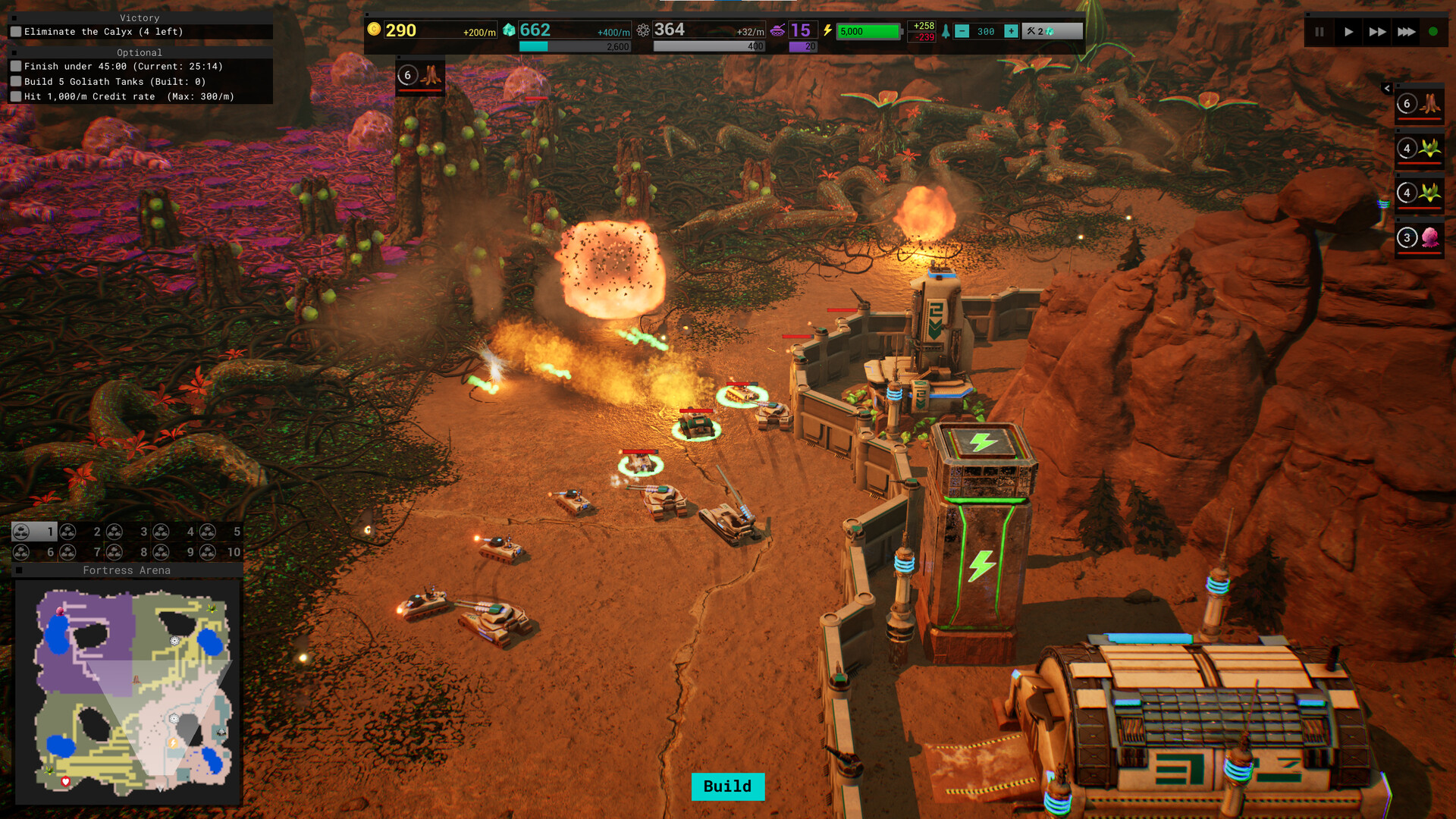 A combination RTS and base builder with a brand new kind of enemy. Boss-like and ever evolving, the Calyx are a group of powerful plant-aliens that, left unchecked, quickly spread to control swathes of the map.
