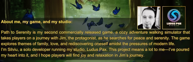 Path to Serenity is a cozy walking simulator that takes players on a heartfelt journey in the shoes of Jim, a man torn between career ambitions and the family he’s drifting away from. As the pressures of work mount, he realises he’s losing more than he’s gaining. Guided by his aunt Didi’s advice, an unexpected trip leads him to her cabin—where he may finally rediscover the path he was meant to follow.