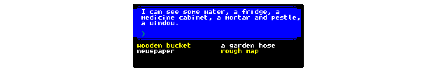 Above the command prompt in the blue area is a list of all the items present in the location you are standing in, while the black area under is your inventory, where all your possessions are located.