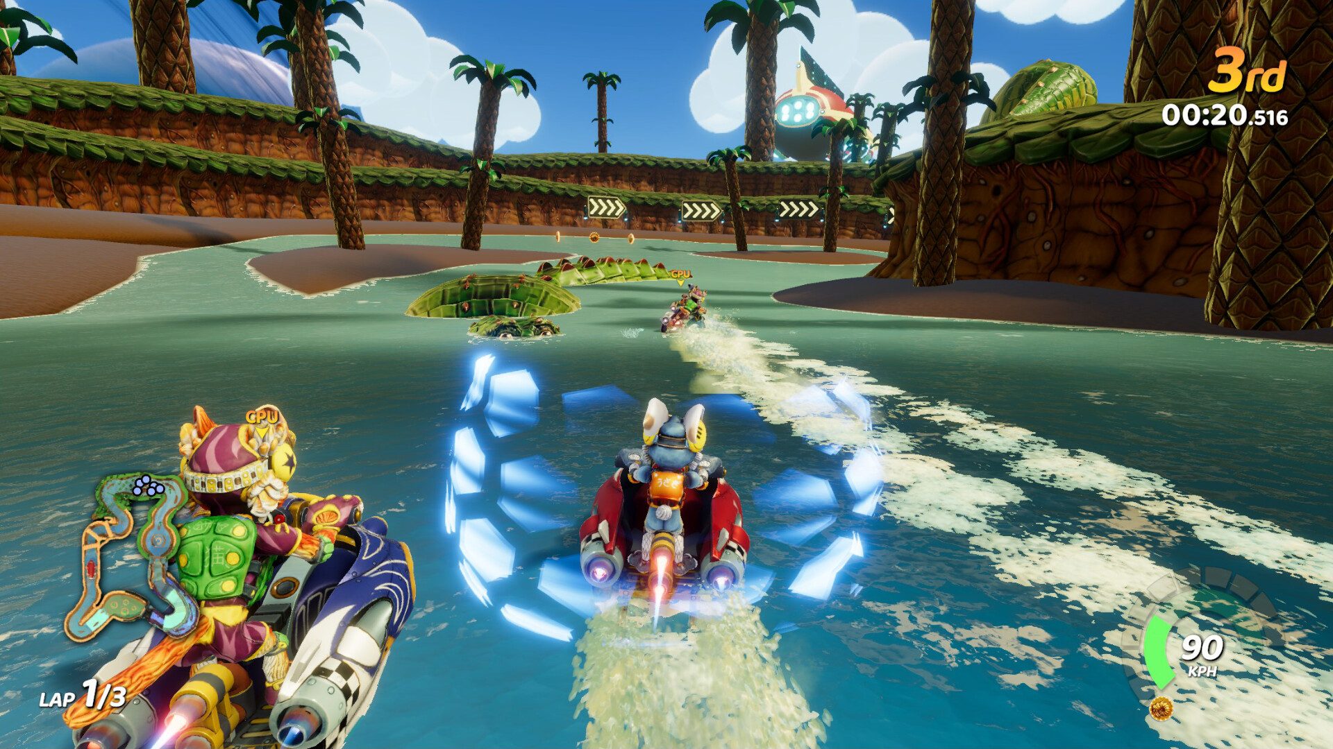 Choose from a vibrant roster of unique characters, each with distinct personalities, skills and driving attributes. Explore an array of eye-catching tracks – ranging from primordial swamps & forests to volcanic worlds and magical crystal caves – all featuring dynamic water conditions and hidden shortcuts.