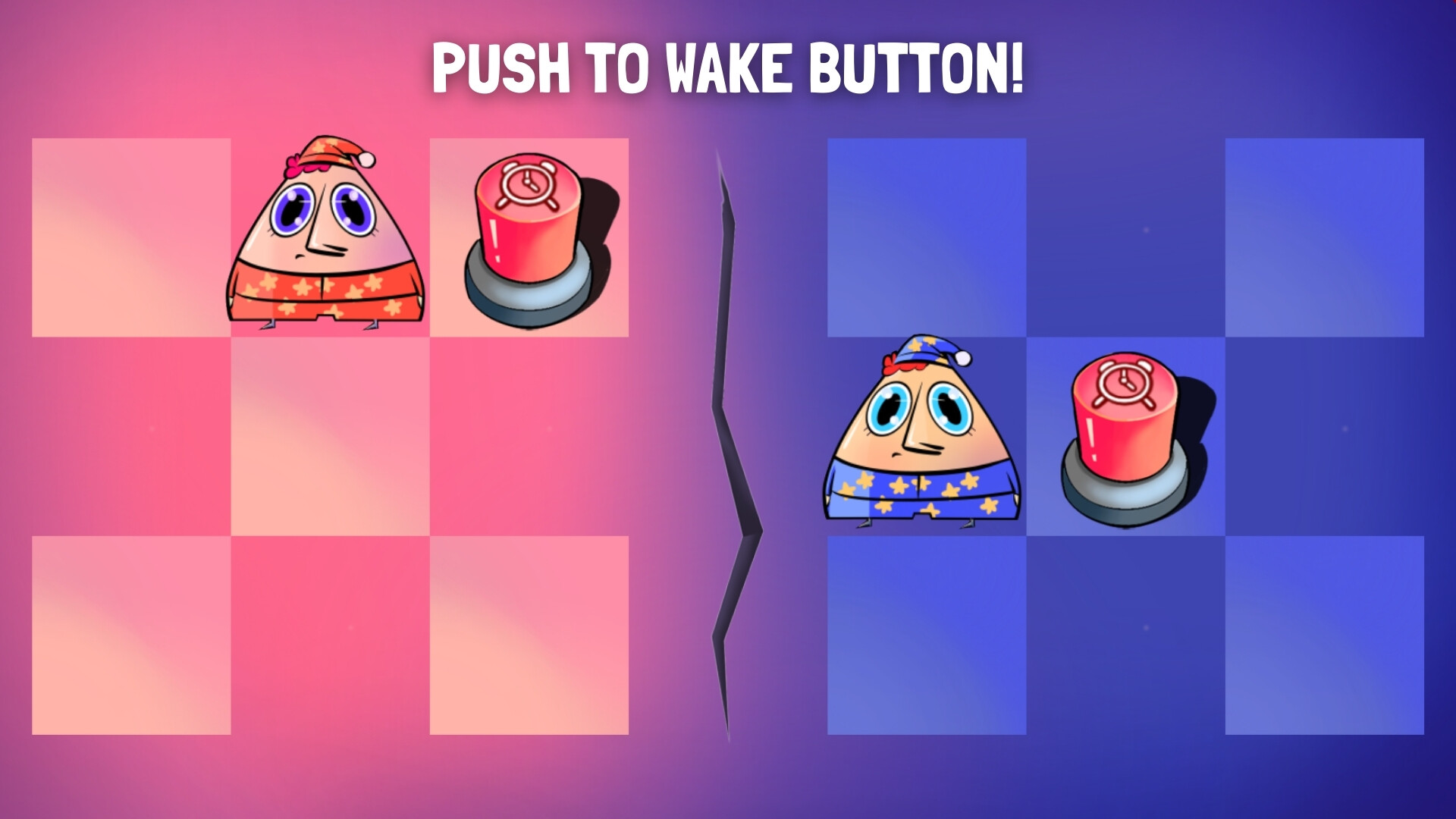 In Twins & Dreams, you control two characters stuck in a dream world. To escape, you need to guide both of them to the “WAKE” button at the same time! But here’s the twist: every move you make affects both characters, and ghosts will chase you if you’re not careful!