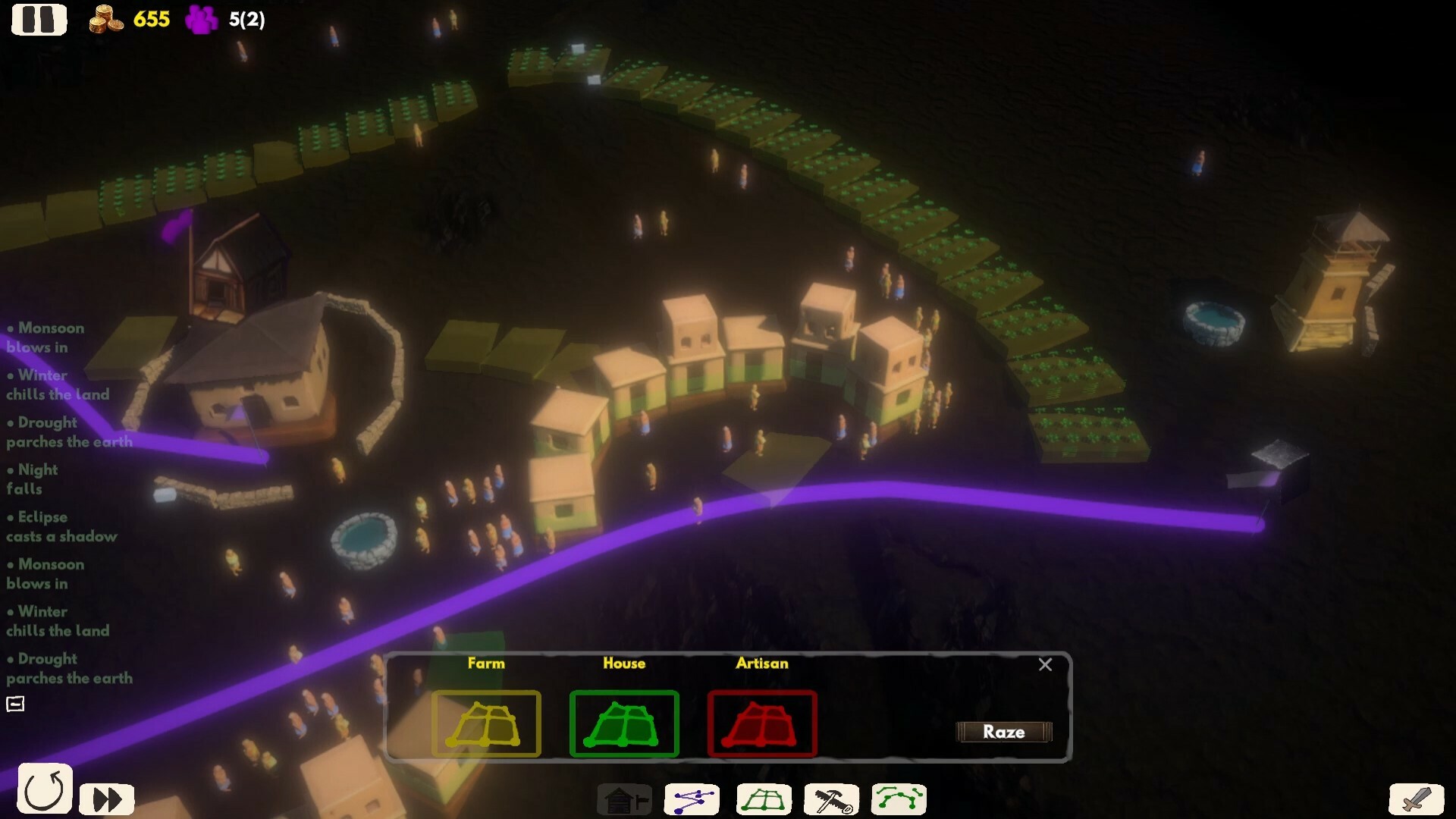 City-builder style zoning for farmland, residential, commercial.