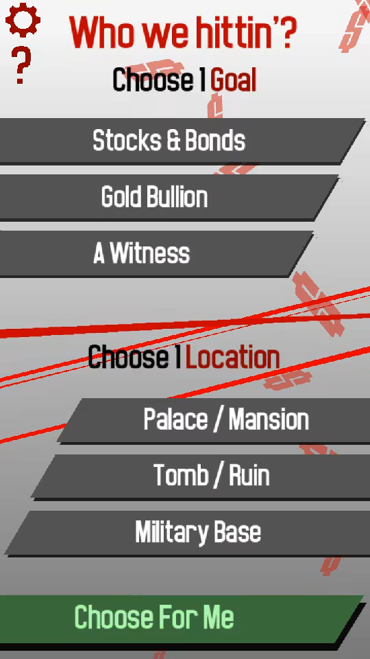 First, you'll pick a location you're breaking into and a thing you're trying to steal. Pick anything that sounds cool!