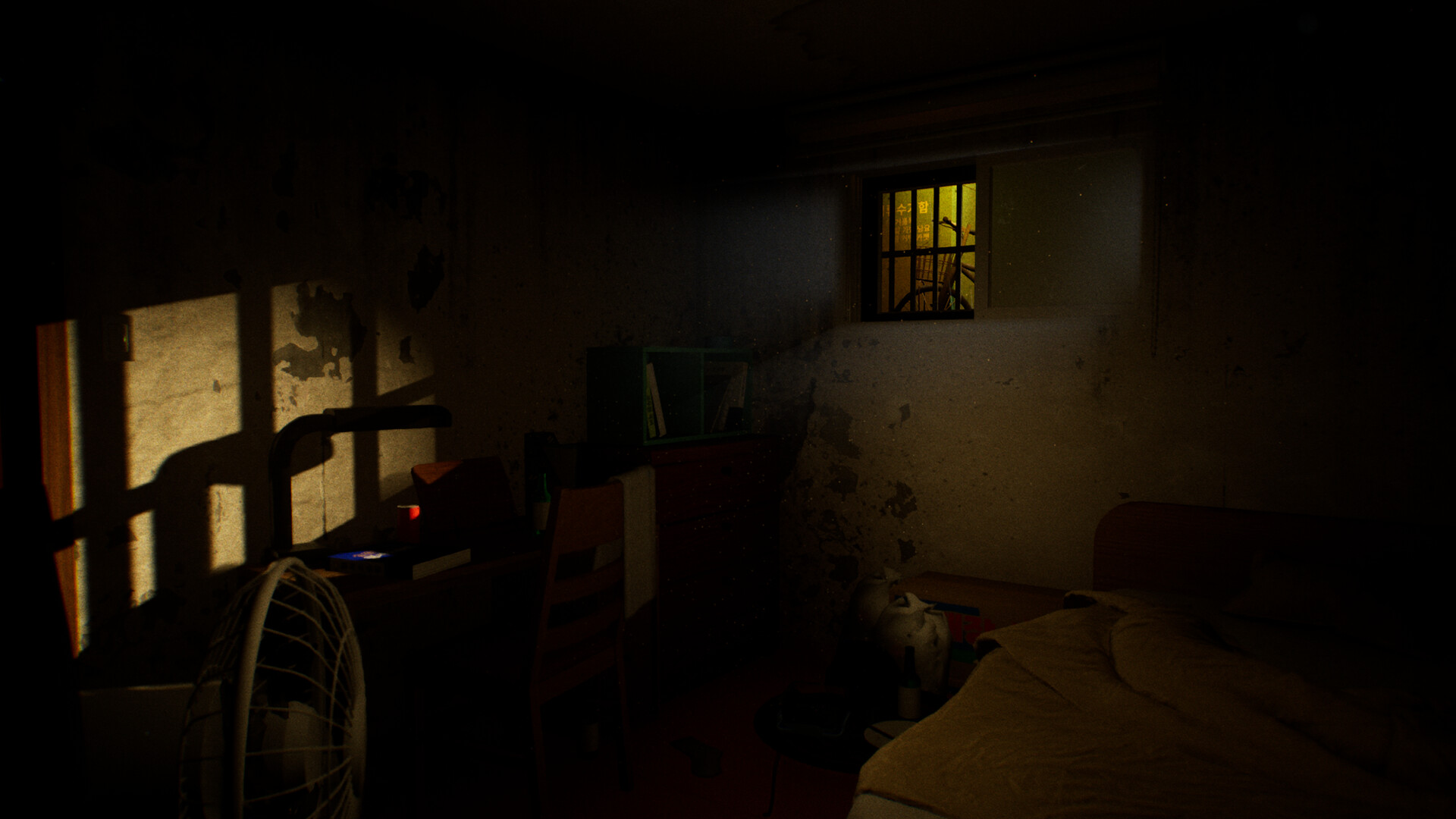 You wake up in a room of a semi‑basement apartment building.