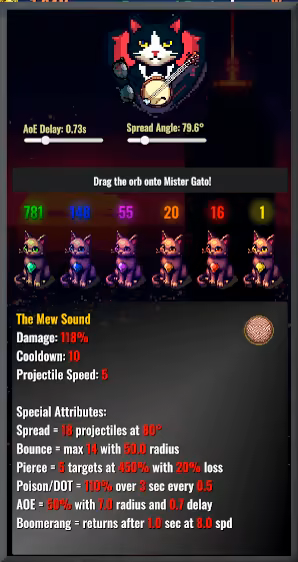 Your basic skill starts humble but as you defeat enemies collect orbs you can upgrade The Mew Sound and become the next Meowsiah! Apply orbs of differing rarities to upgrade your basic skill. The rarest orbs provide powerful buffs at a trade off. This system can be expanded in the future to apply all sorts of random effects and curve RNG.