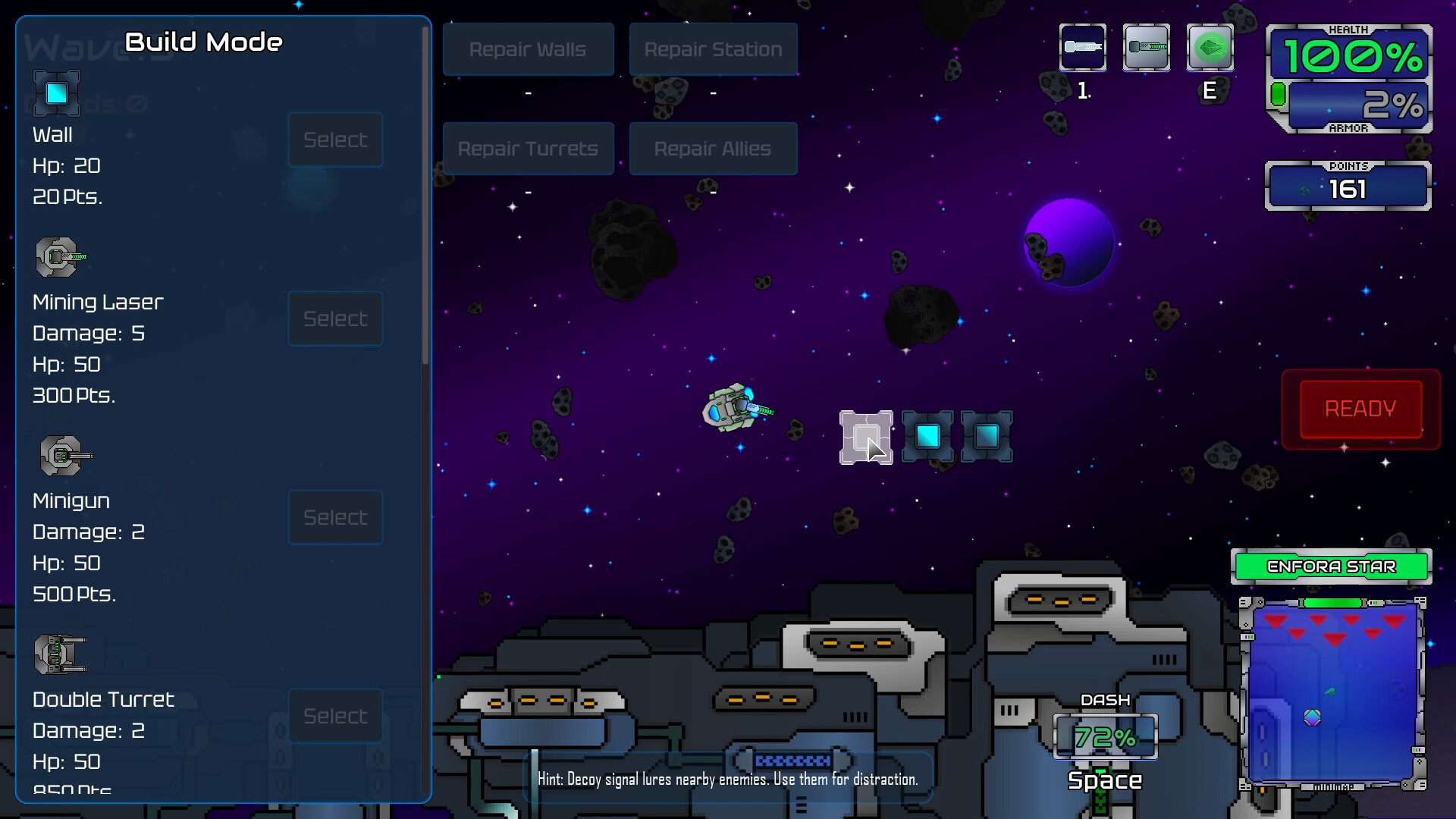 Take control of your spacecraft in this innovative top-down shooter where every strategic decision impacts your final score. Defend Enfora Star space station against droid swarms, but here's the twist: every turret, wall, and allied drone you purchase reduces your high score. Do you play it safe with heavy defenses, or risk everything for maximum points?