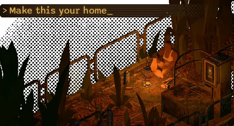 In addition to traditional hunger, thirst, and shelter needs, you must balance your character's comfort and happiness. Build a home wherever you can; an abandoned air duct, office supply closet, or a leafy hovel by a reactor cooling pool. Furnish your dwelling with cozy furniture and decorate it with strange artifacts.