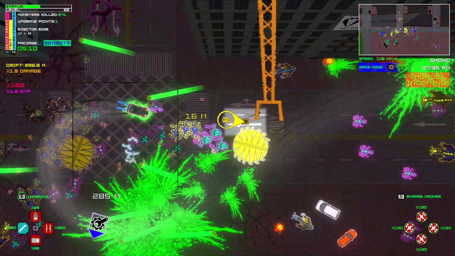 🔥 Drift or Die – Master fast-paced drifting mechanics to maintain speed, escape danger, squash hordes of monsters, and navigate the broken streets.