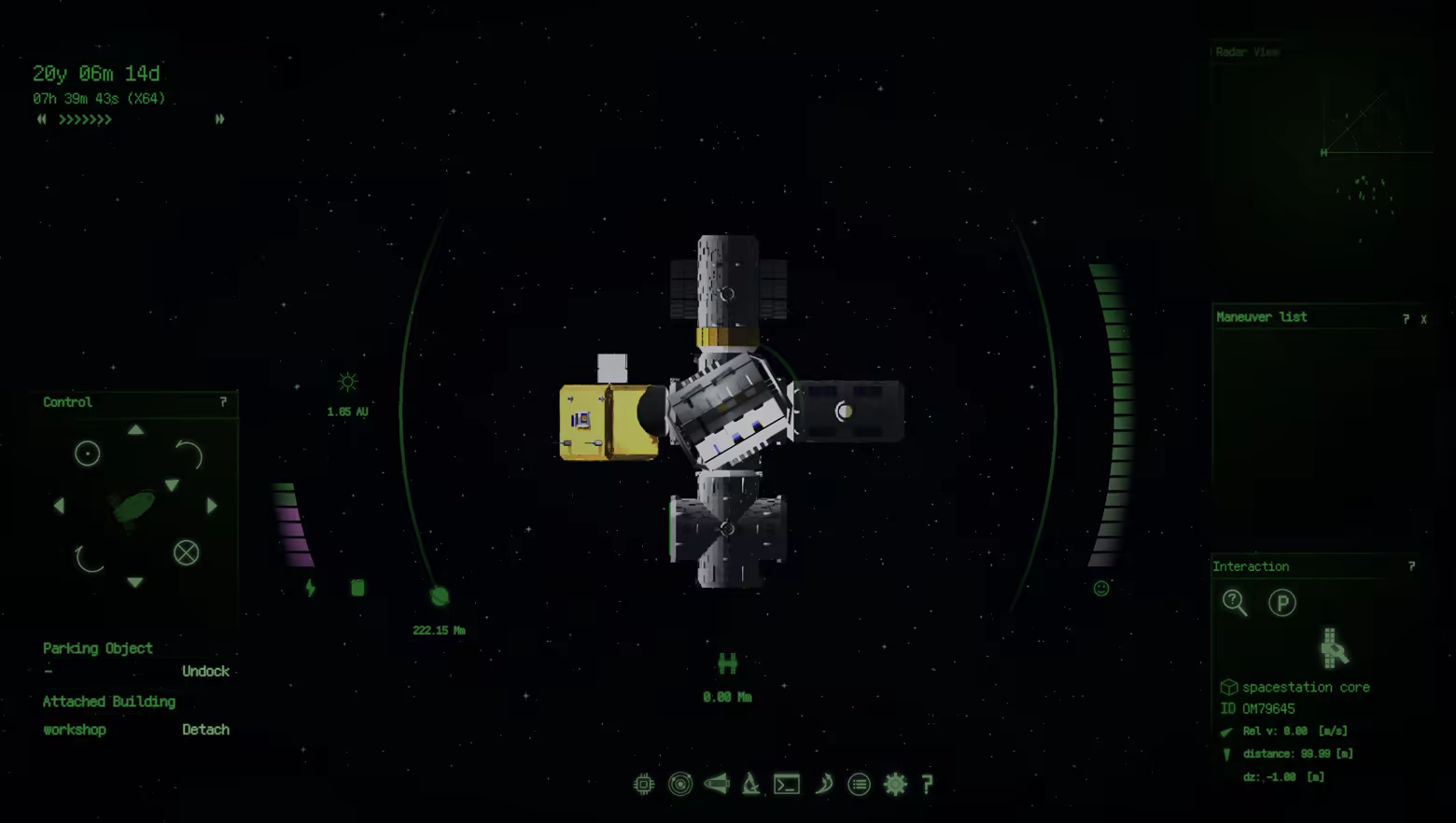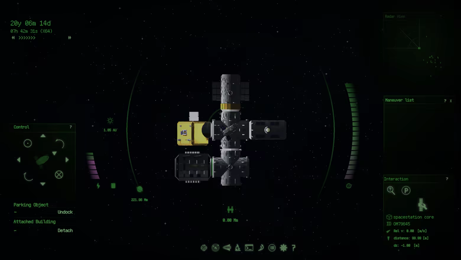 An early prototype for orbital detection and interception is already in place. Future combat features—still under experimentation—will focus on beyond-visual-range engagements based on strategic orbital planning and delta-v management, rather than close-quarters action or reflex-based gameplay.