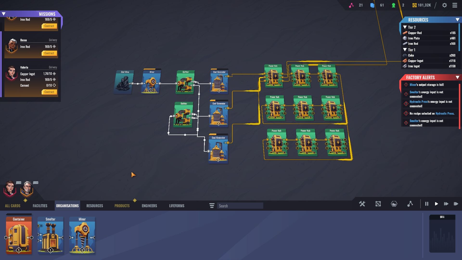 Engineer cards can be assigned to production and storage units to boost efficiency, unlock new recipes, or reduce energy consumption. Assignments take effect after the current production cycle, encouraging careful planning.