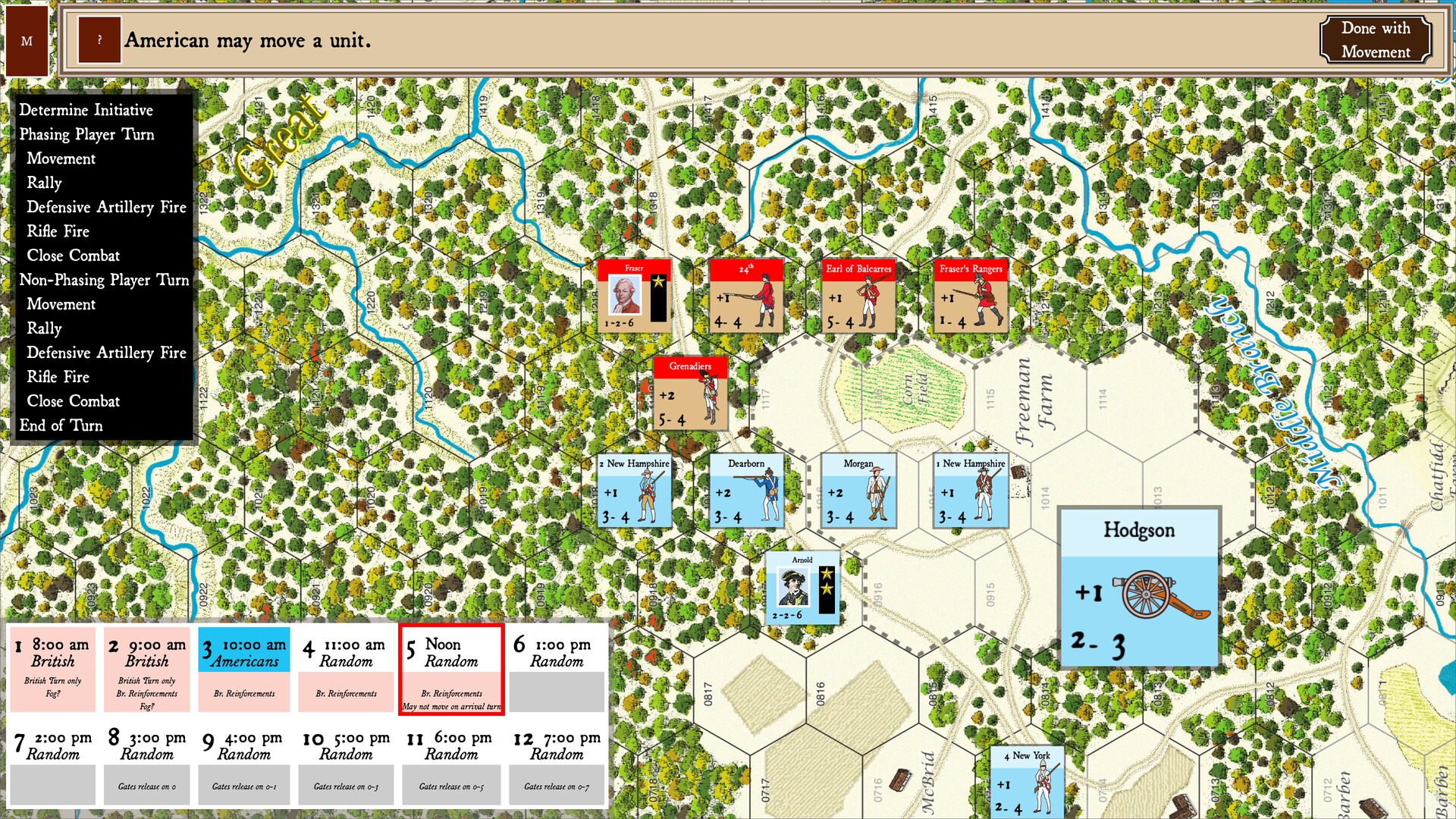 Each side has an historically accurate order of battle that encourages the player to attempt to outdo the generals of history. Saratoga has scenarios that simulate "what-if" situations as well. What if the British had counter-attacked the next day? What if Benedict Arnold had gotten his way and been free to attack?