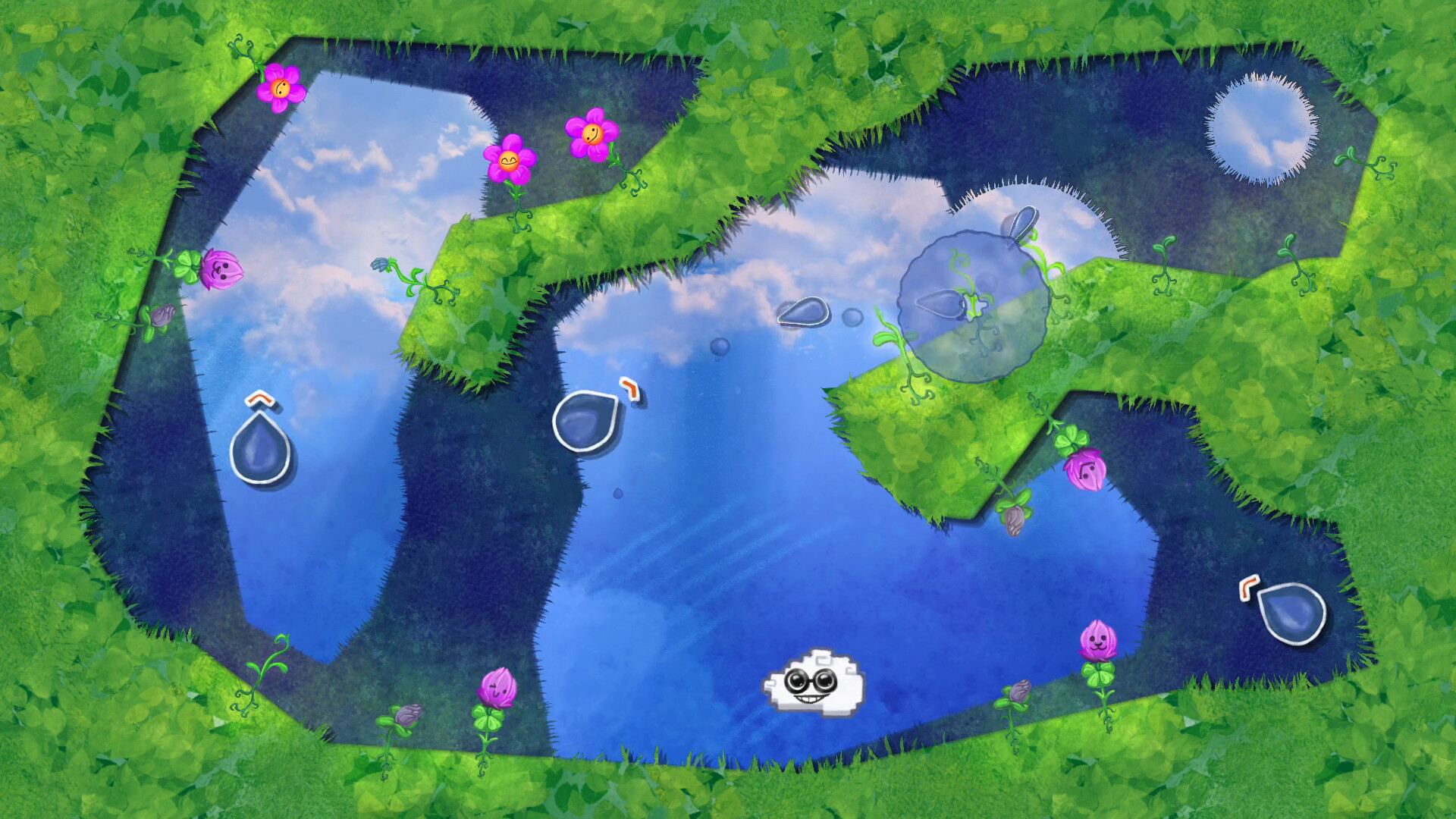 As a newly formed cloud, venture out into a lost world filled with strange landscapes to fulfil your singular purpose: blooming flowers. Flowerdrops is a meditative puzzle game with a focus on satisfying physics-based gameplay and strong level variety where you use bouncy raindrops to water flowers. Use the power of your droplets to ricochet off of walls, navigate through obstructions, and ultimately grow as many flowers as you can - turn by turn, stage by stage, drop by drop. An ever expanding suite of environmental hazards and bizarre obstacles means you must plan each shot carefully and make every drop count. Nowhere is too remote, too dangerous, or too absurd for you to grow your flowering friends.