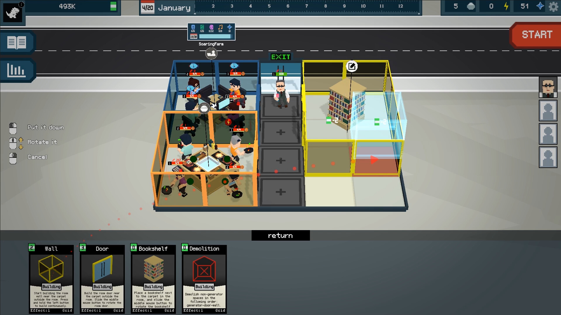 During the preparation phase at the beginning of the year, players can use construction cards to expand the site and build facilities. They can also use hiring cards to hire employees based on project needs. Facilities are divided into R&D, Food, Power Generation, and Learning. Players must allocate talent to each department to keep the company running. Players can assign skill cards to their bosses and management employees. Card holders cannot hold more cards than their maximum action points. Cards are divided into construction cards, hiring cards, trap cards, and skill cards.