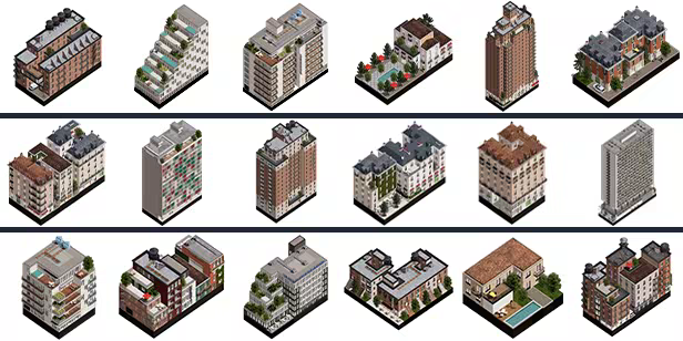 Mix and match a wide range of architectural styles — from traditional to modern — to create buildings that reflect your vision. Each style comes with modular façade pieces including a variety of windows, doors, balconies, and more. Some façades are dynamic: when placed together, they interact and combine into larger, seamless architectural compositions beyond the standard 3x3 meter tiles.