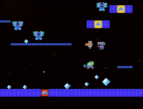 Waves of the space monsters will attack you each level, you must dodge and jump around them and destroy them all with your blaster-arm!