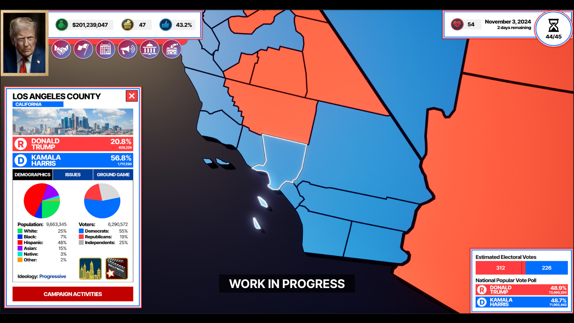 Experience the tension of the results coming in live, state by state, county by county. Watch the map shift in real time as votes are counted and momentum swings. Every decision you made on the trail culminates in this moment. Will you see a glorious victory? Or suffer a shocking upset?
