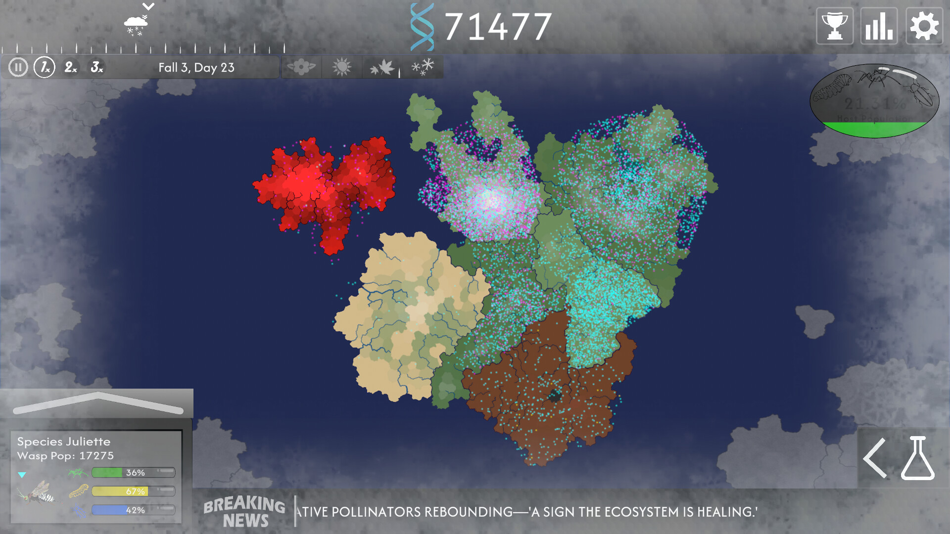 Design and deploy a variety of specialized wasps to target different invasive species, adapting to changing seasons, terrain types, and resistance patterns. From alpine meadows to desert canyons, each biome presents unique challenges and different pest insects that require careful planning and scientific precision. Create the most efficient and effective parasitoid wasps to save the national park and restore ecological harmony.