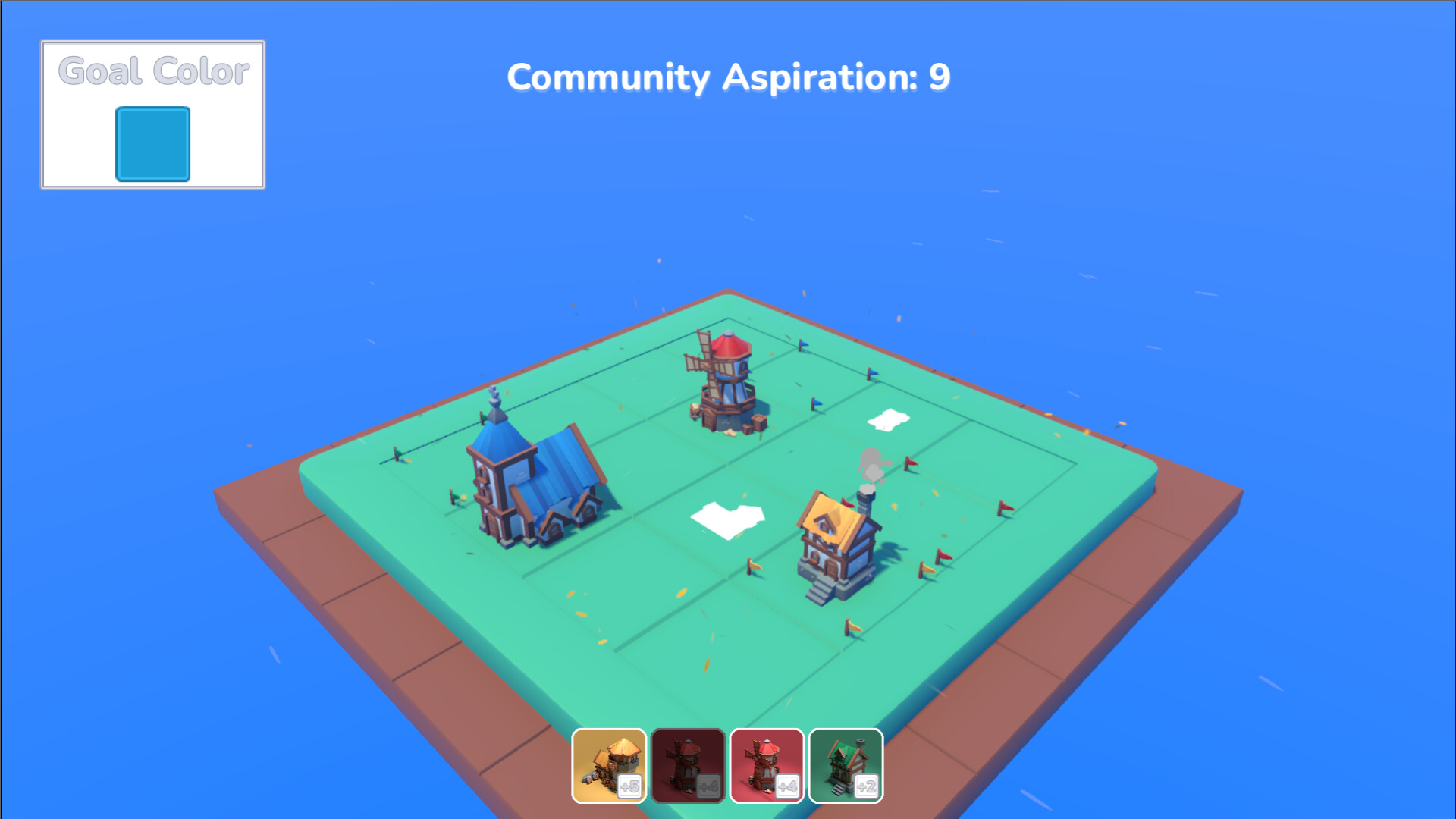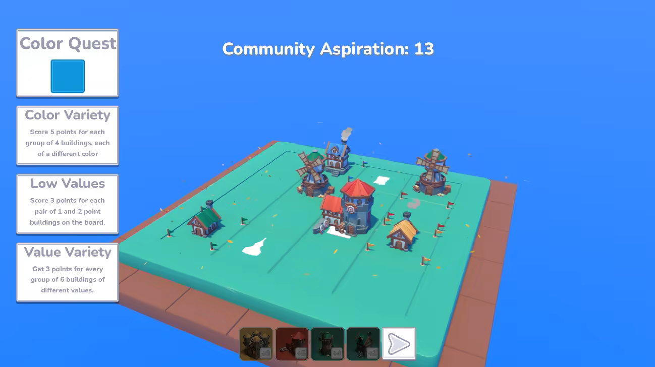 Each board presents you with a new challenge: to beat a “Community Aspiration,” represented by the buildings you didn't choose. Can you build an even more valuable settlement with the pieces you have?