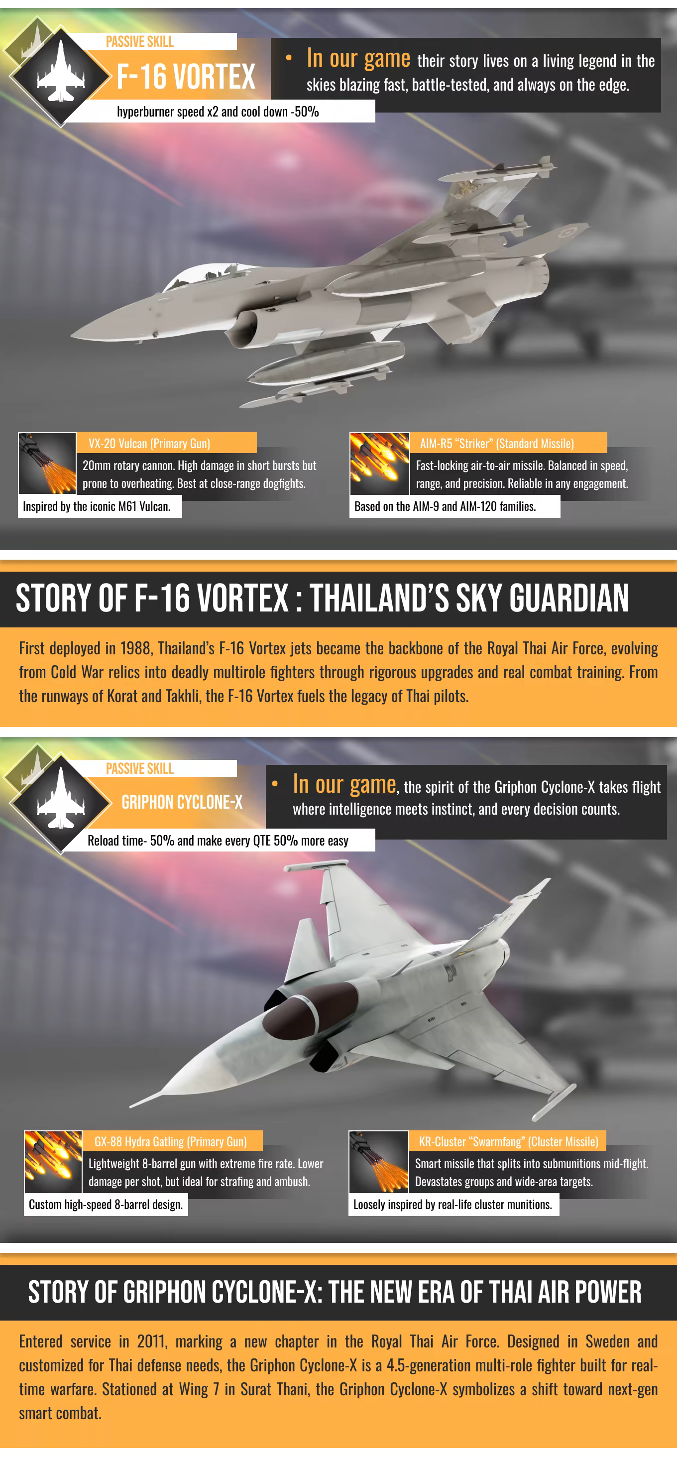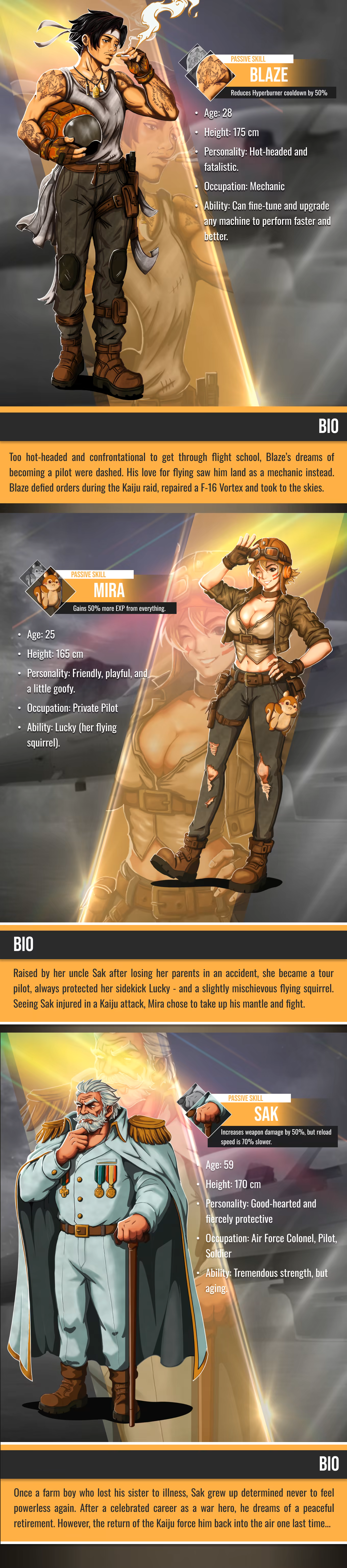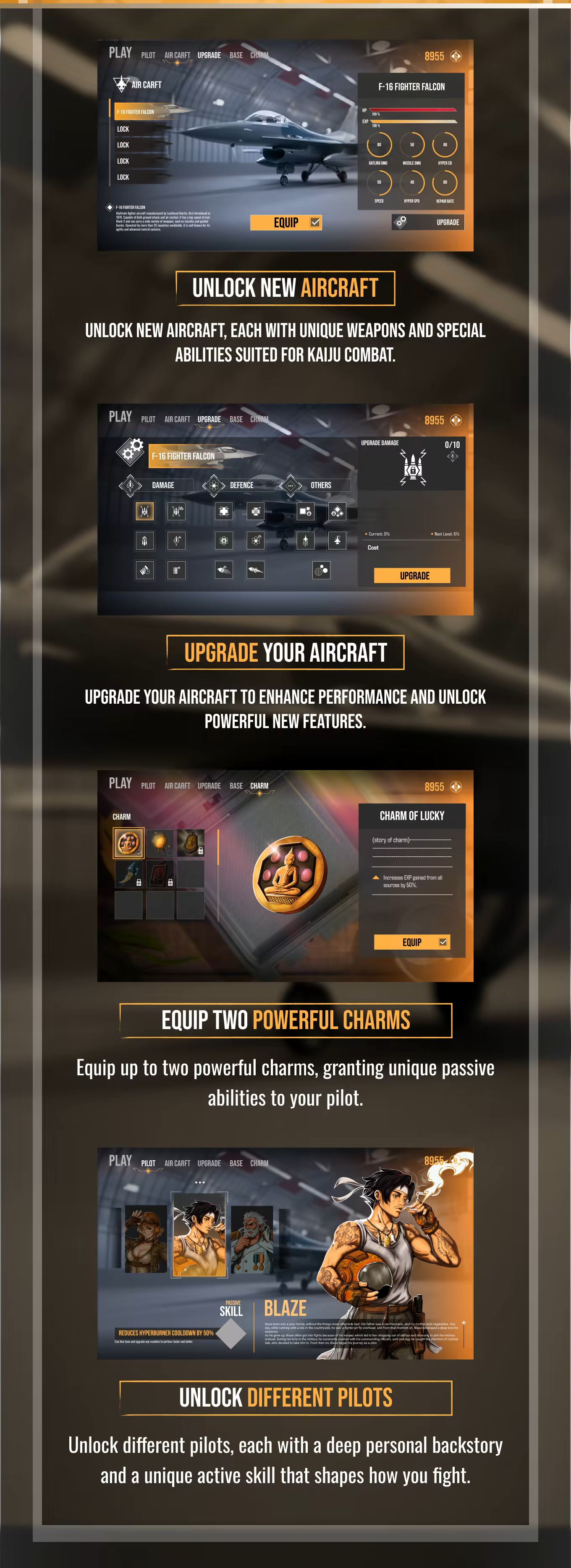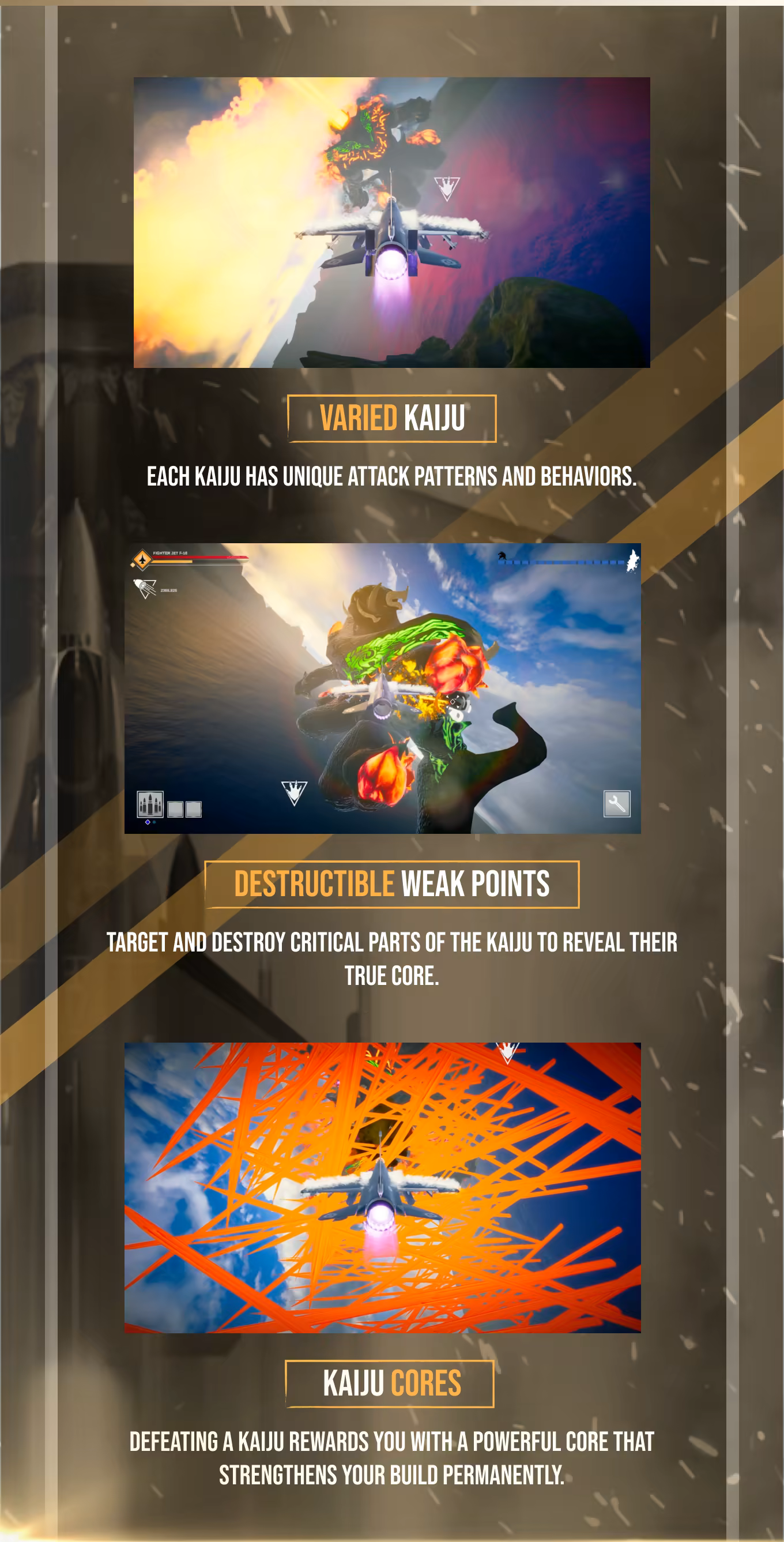 Extinction Core: World War Kaiju is a third-person aerial shooter that blending roguelite progression with epic boss-based aerial combat. Step into the cockpit of a customized fighter jet and take on towering Kaiju before they wipe out humanity. There are three pilots to choose from, two aircrafts, and endless load-out options to evolve, experiment and iterate your build through roguelite aerial combat gameplay.