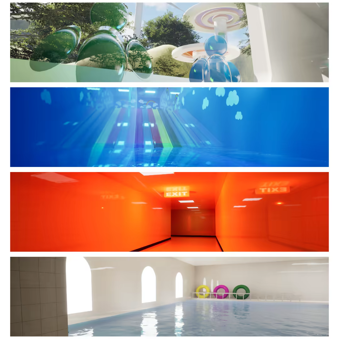 We’ve created all of them. You can explore liminal places that feel strangely familiar, wander through unsettling dreamcore worlds where something feels off, or step into the Frutiger future we were promised but never received.