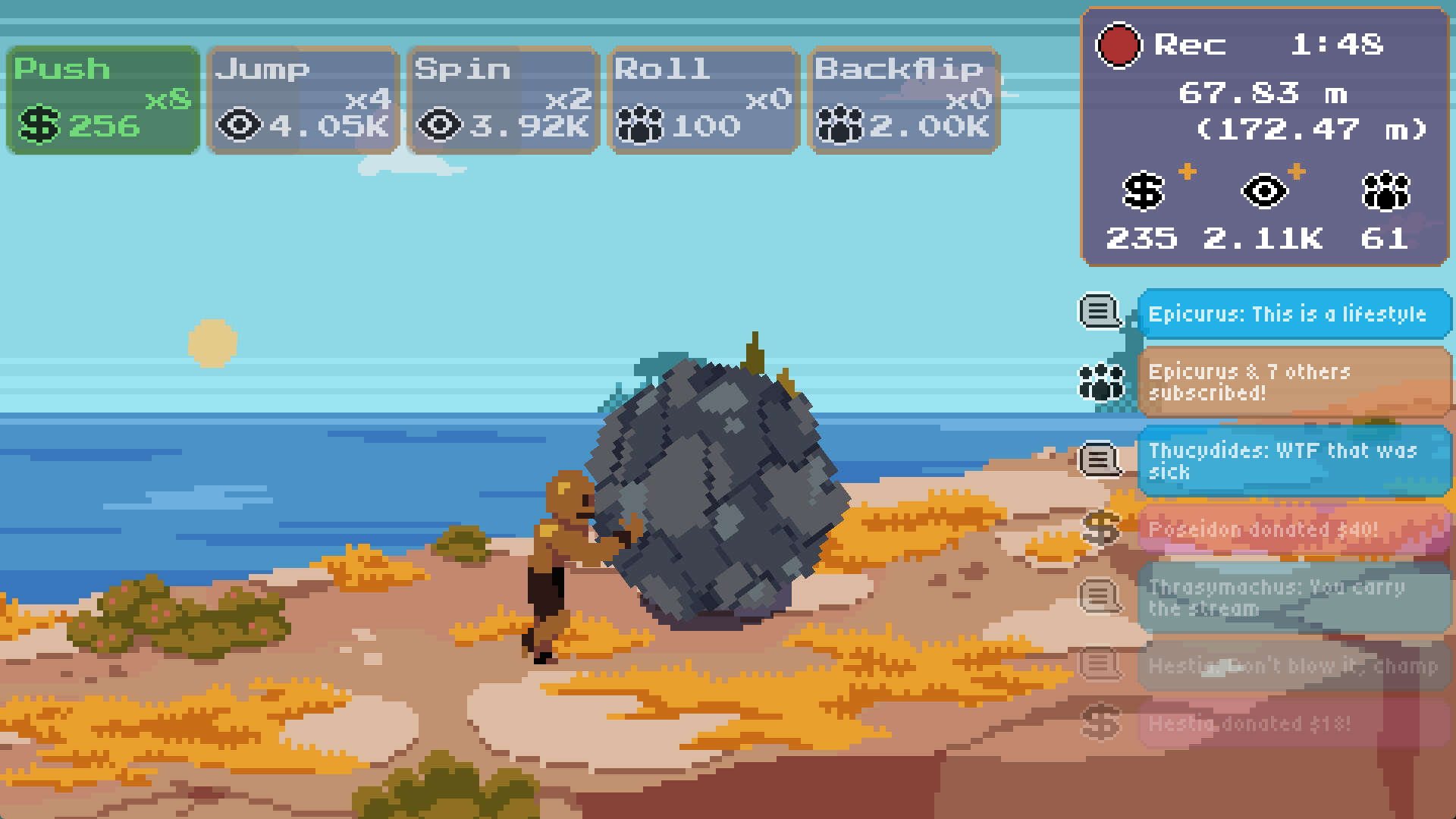 Imagine Sisyphus Happy is a fast-paced clicker + QTE game about life, spectacle, and finding meaning in repetition. Roll your boulder, pull off stunts, and try to make the eternal grind worth living.
