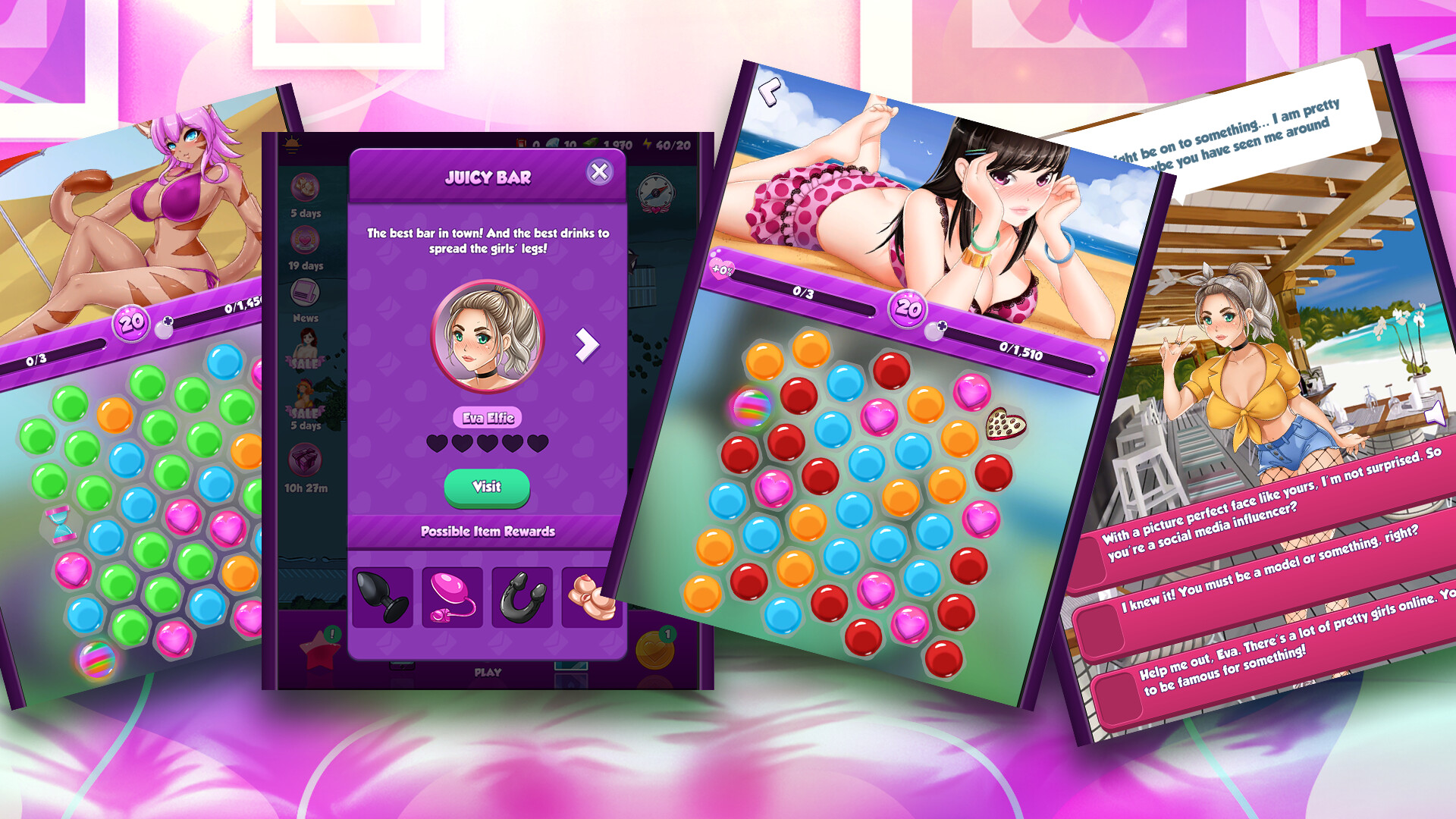 You can’t say no, of course, so this is how your quest of banging all the sexy chicks of Naughty Beach begins! Discover all the locations, jump between a wide variety of tantalizing ladies and learn how to sweep them off their feet until you score big!!